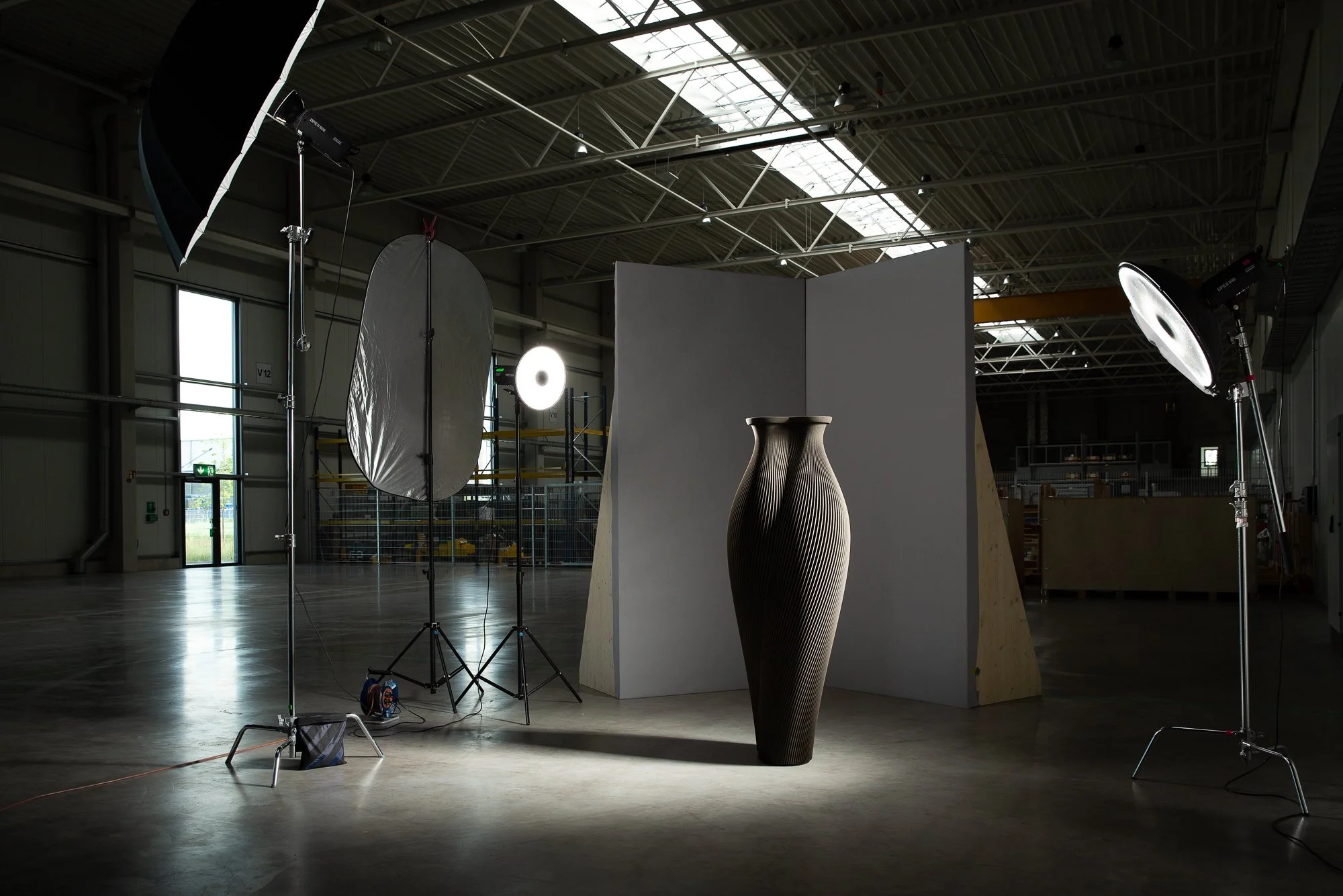 The stunning Si02 '1755' vessel, an elongated iteration of our beloved Twisted Pair. Our exploration into 3D printing in sand has always been driven by a desire to push the boundaries of this craft process. Despite being built by machine, this artwork presented unique challenges due to its size and scale. Through the collaboration of experts, we were able to bring this giant vision to life.